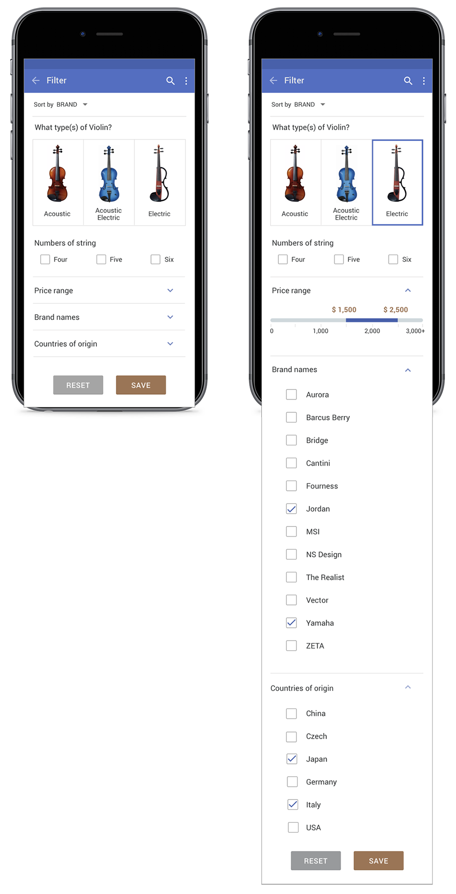 This is an in class design challenge focusing on search results and filter interface. I created this for an imaginary violin online shop. I added an ecommerce product result listing page.